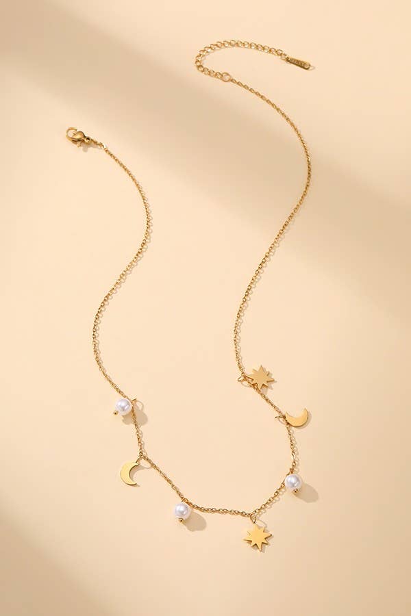 Titanium Steel Non-Tarnish Station of Drop Moon Sun Pearl Necklace, a stunning piece of jewelry designed to dazzle and endure. Crafted from premium titanium steel with an exquisite 18K gold finish, this necklace features a series of delicate sun moon pearl-shaped pendants suspended along the chain.